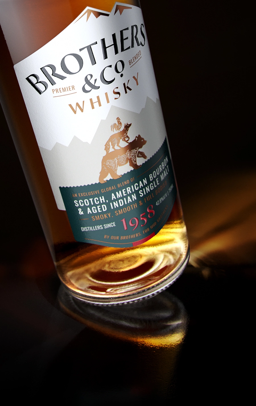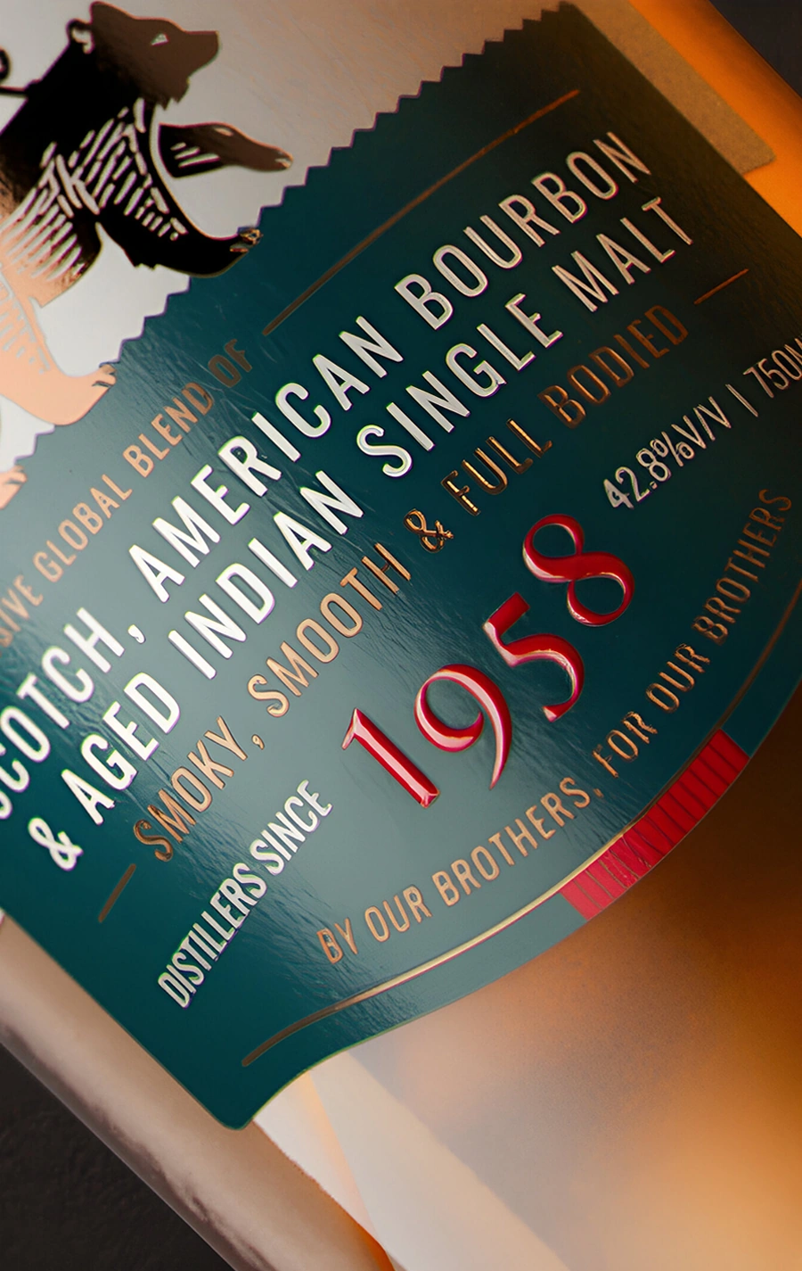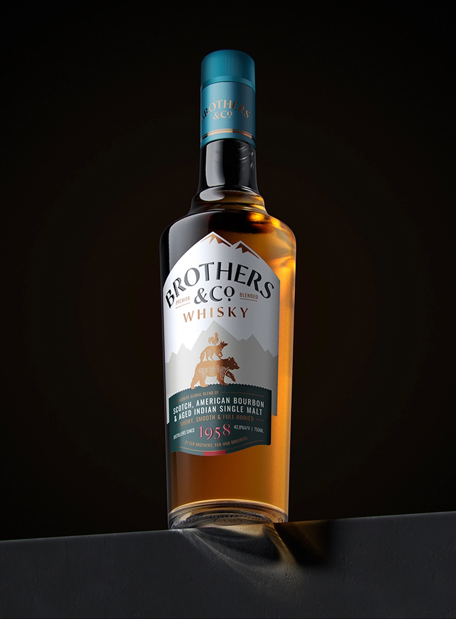 Design: The design deliberately rejects the norm of relying on familiar signifiers such as royal crests and ornamental ribbons. In their place, it introduces narrative as a strategic device. The name Brothers & Co. becomes the foundation for the brand's visual language, expressing ideas of camaraderie, kinship, and shared experience. This is brought to life through the emblem of 'The Wild Friends', rendered with a folk-tale quality that invites curiosity and encourages interpretation. Structural and informational cues are borrowed from higher-end international whiskies, particularly through the secondary lower-label where detailed information respects the viewer's discerning ability.
