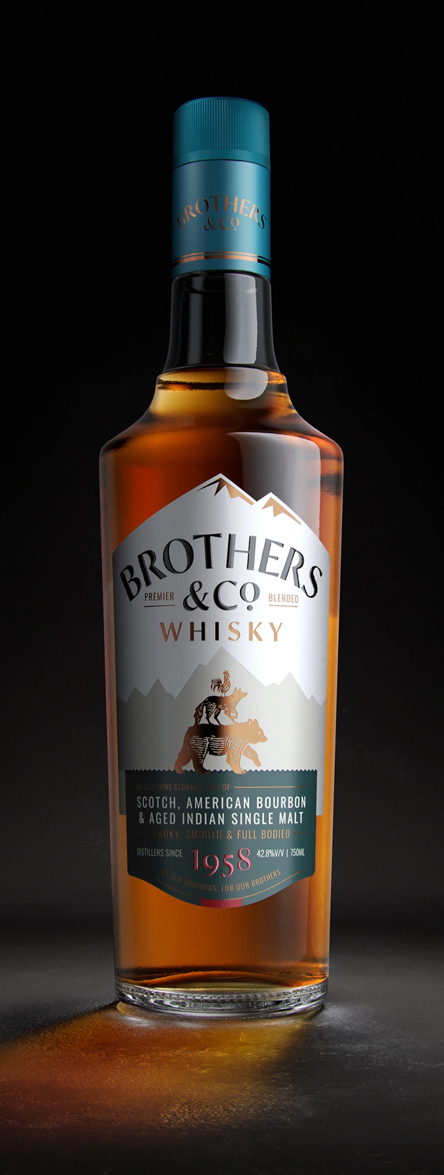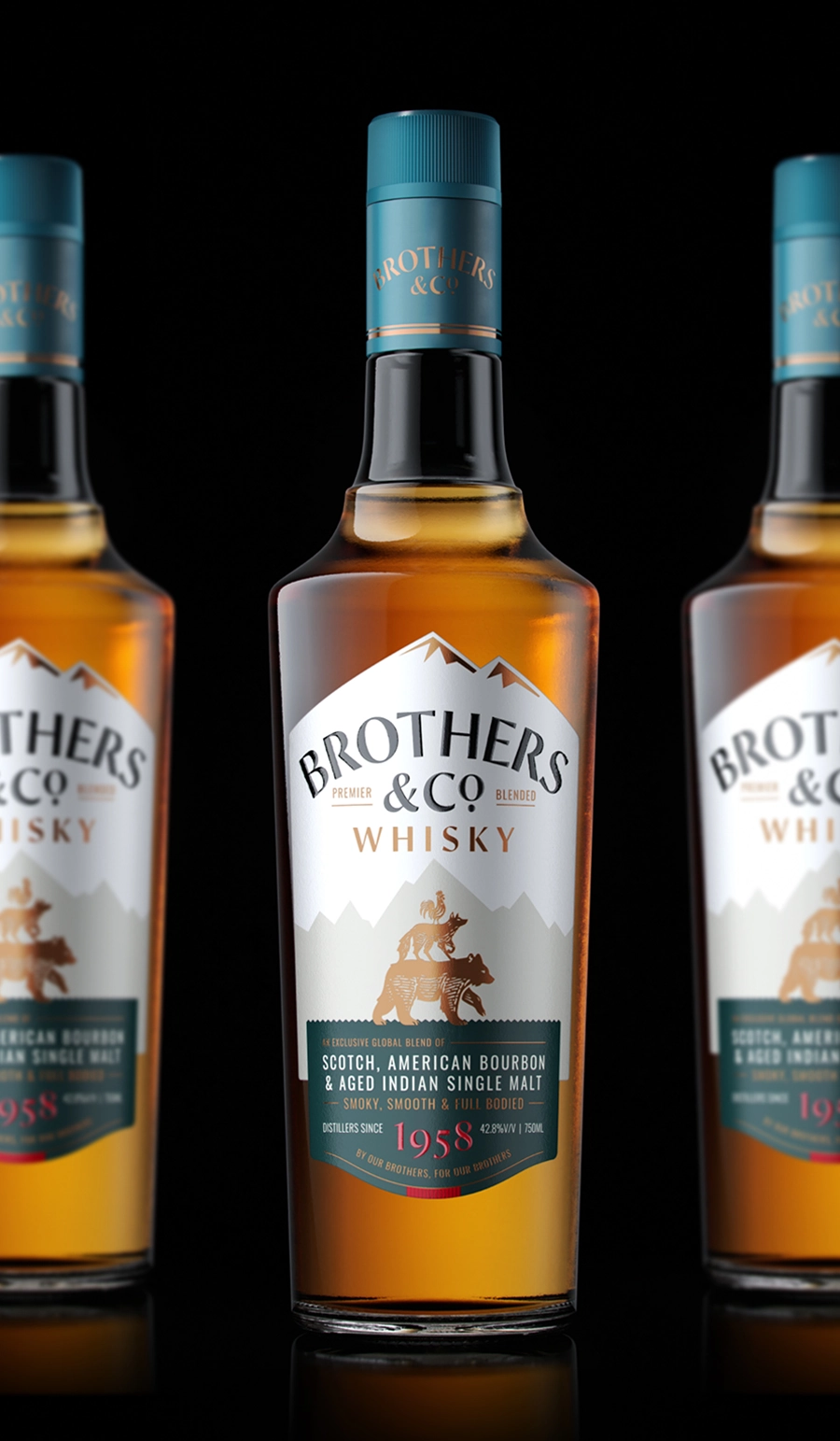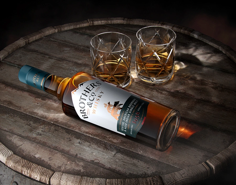 Design: The design deliberately rejects the norm of relying on familiar signifiers such as royal crests and ornamental ribbons. In their place, it introduces narrative as a strategic device. The name Brothers & Co. becomes the foundation for the brand's visual language, expressing ideas of camaraderie, kinship, and shared experience. This is brought to life through the emblem of 'The Wild Friends', rendered with a folk-tale quality that invites curiosity and encourages interpretation. Structural and informational cues are borrowed from higher-end international whiskies, particularly through the secondary lower-label where detailed information respects the viewer's discerning ability.