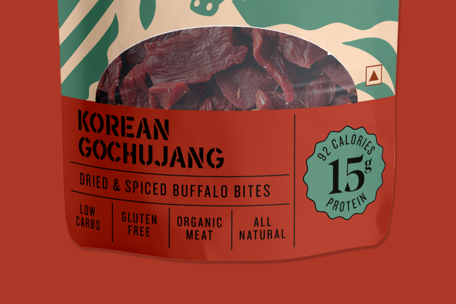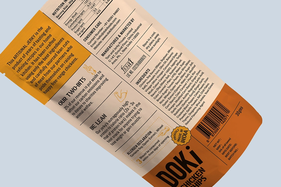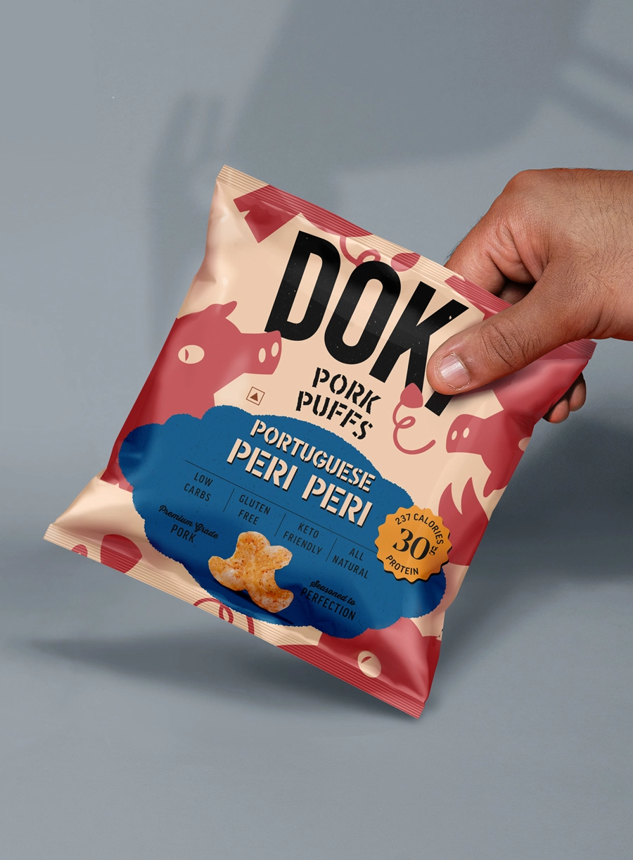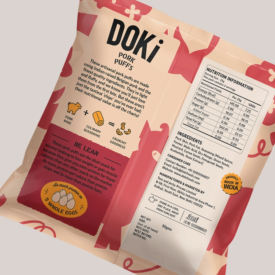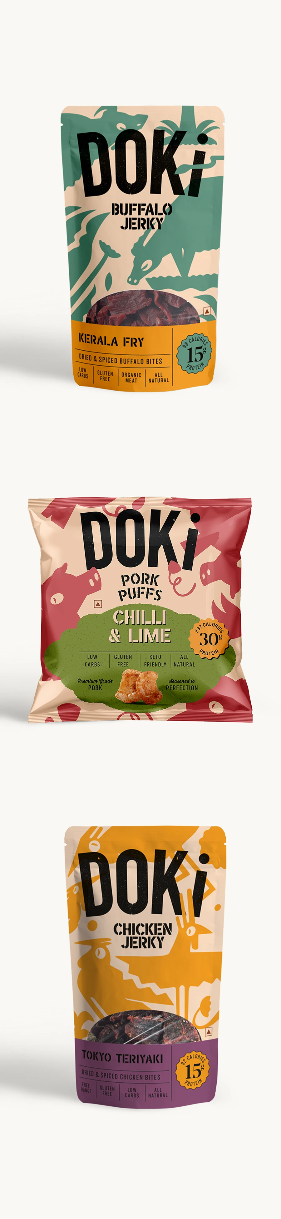 Design: Being the first player in the market, designing the brand and packaging gave us the freedom to create an entirely new visual language, not limited by category expectations. Consciously staying away from the 'wild west' theme of most jerky packaging outside India, Doki establishes its own bright and fun take on delicious meat snacks with a focus on nutrition, sustainable practices and delicious flavours.