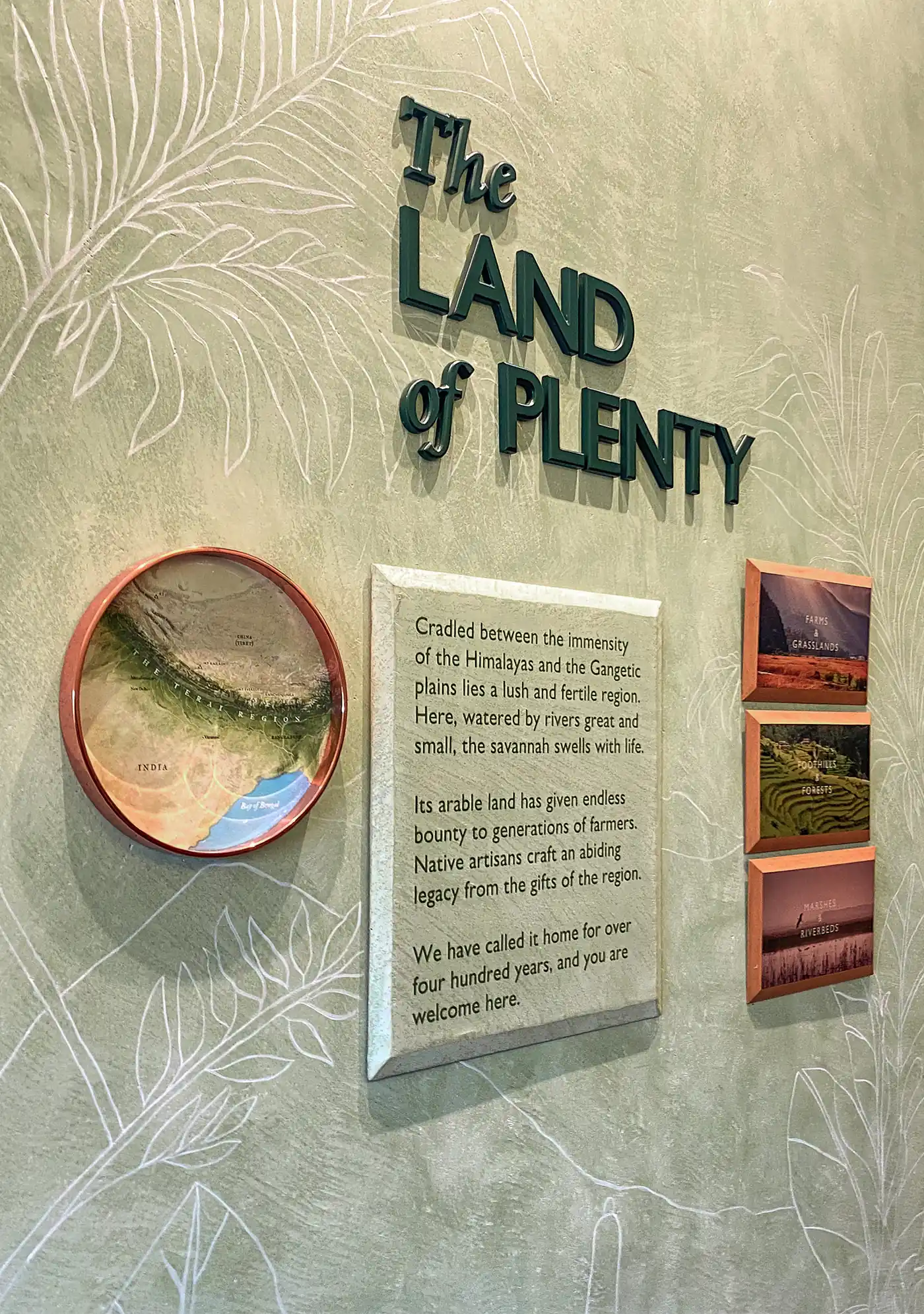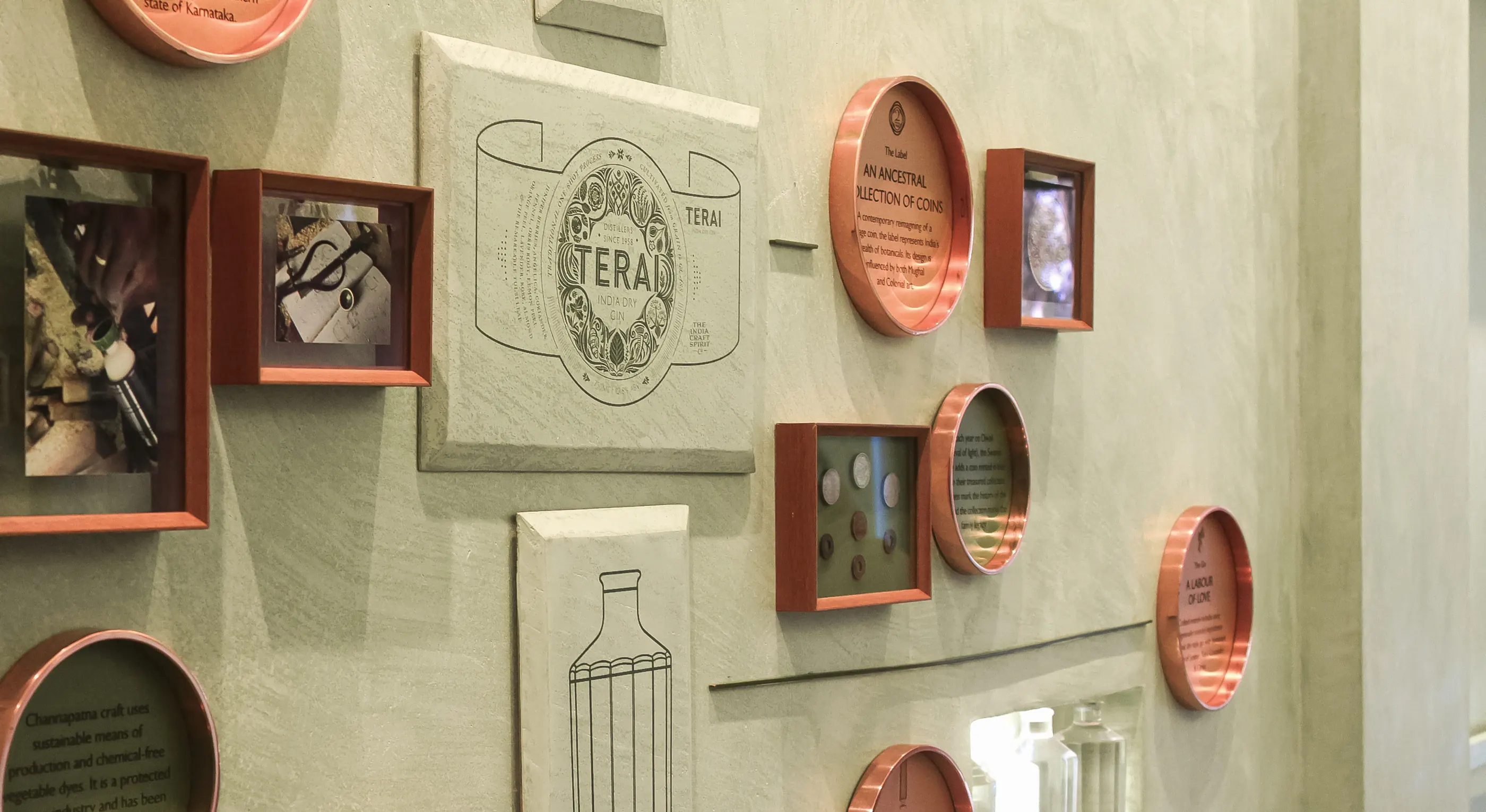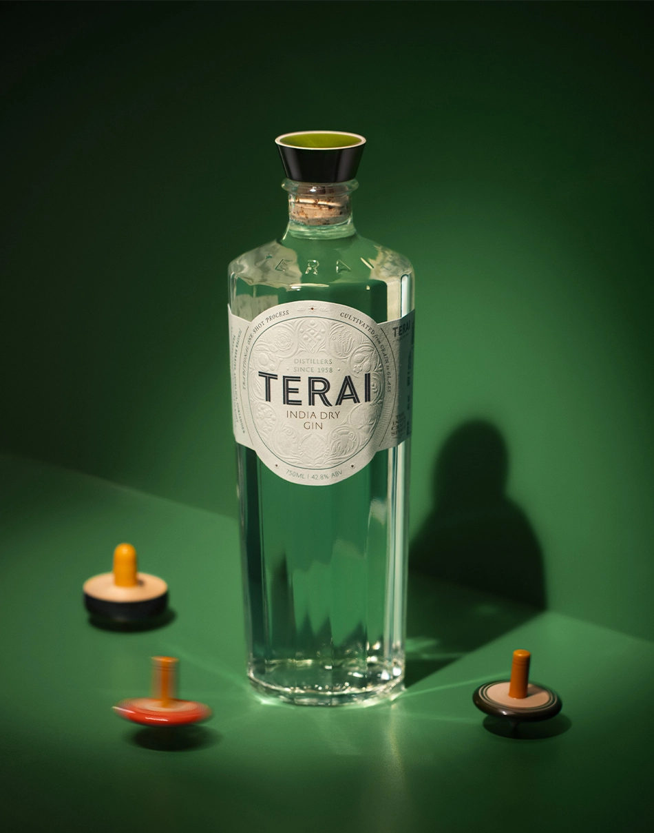 Designed as a cool green respite from the Rajasthan heat, the exhibition space is meant to feel like a refreshing sip of gin after the blazing sun outside. This immersive environment becomes the stage on which Terai tells its story—a proud showcase not only of the brand and the Swarup family legacy, but also a quiet remembering of India's often forgotten past. Through stories of botanicals, indigenous spirits, and agricultural traditions, the exhibition articulates Terai's philosophy and firmly places the brand on the global gin map.