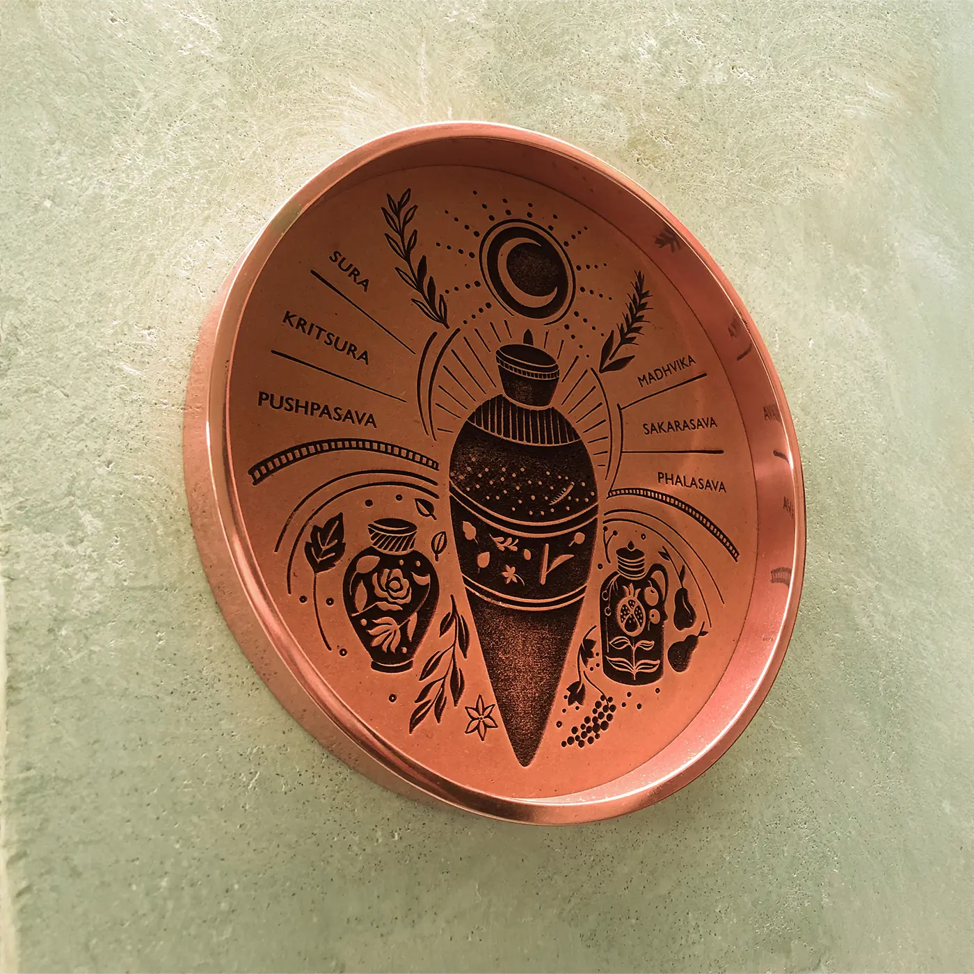 The large hall is designed to serve a dual role—housing the industrial processes of production and bottling, while also functioning as a space for guided tastings. A large screen acts as a visual threshold between these worlds. Terai Gin's eleven botanicals are glorified as brass artefacts, displayed alongside the gin bottles that are elevated to sculptural objects in their own right. An evocative poem sets the tone. Handwoven chairs gather around a central tasting table where the Channapatna craft returns in the form of place settings and coasters. All the elements come together to ground the experience in material and tradition.