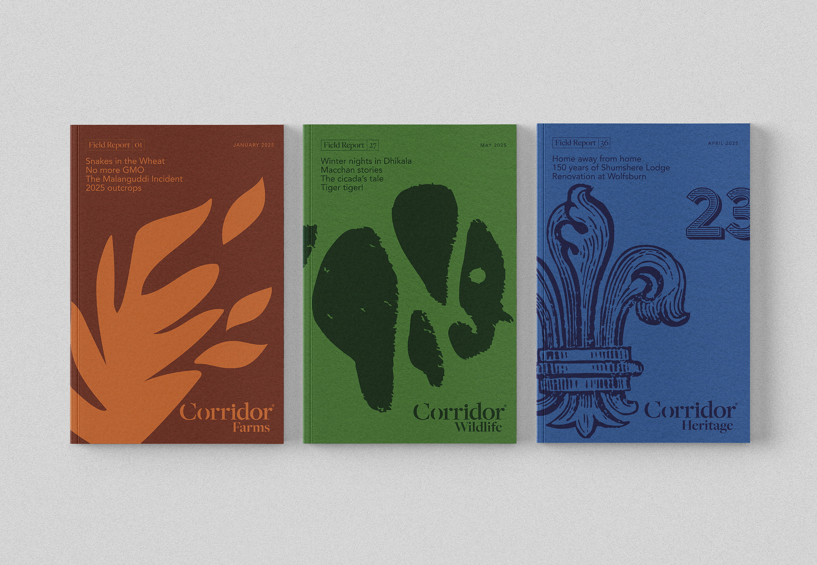 Reconnecting: As an umbrella brand spanning multiple retreats, regeneration and conservation projects, festivals, and products, Corridor's identity required a sense of restraint and longevity. A seemingly classic logotype subtly embeds the idea of regenerating corridors. Patterns, illustrations, and symbols extend this language, echoing the slow formation of connections between once-isolated ecosystems.