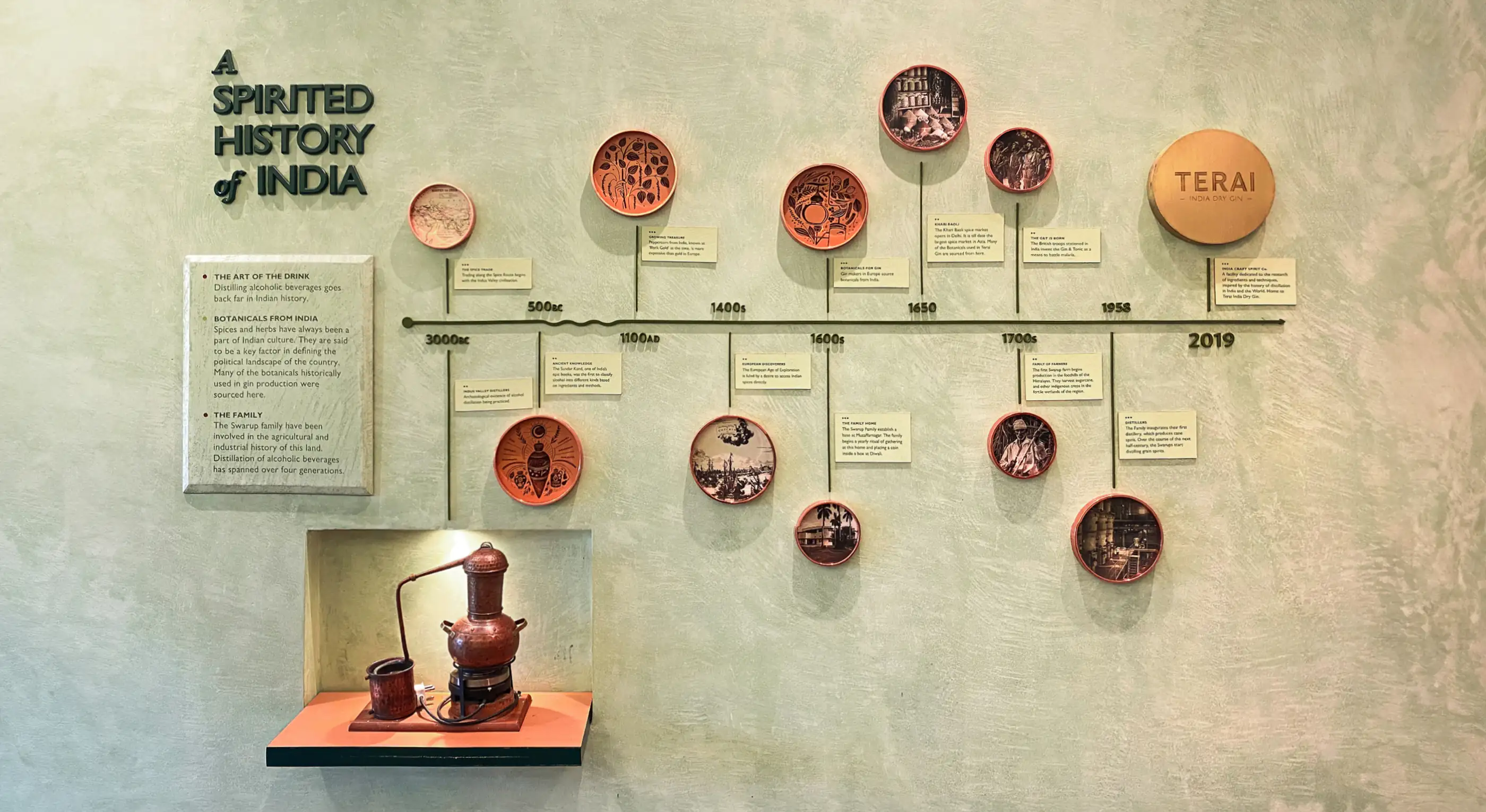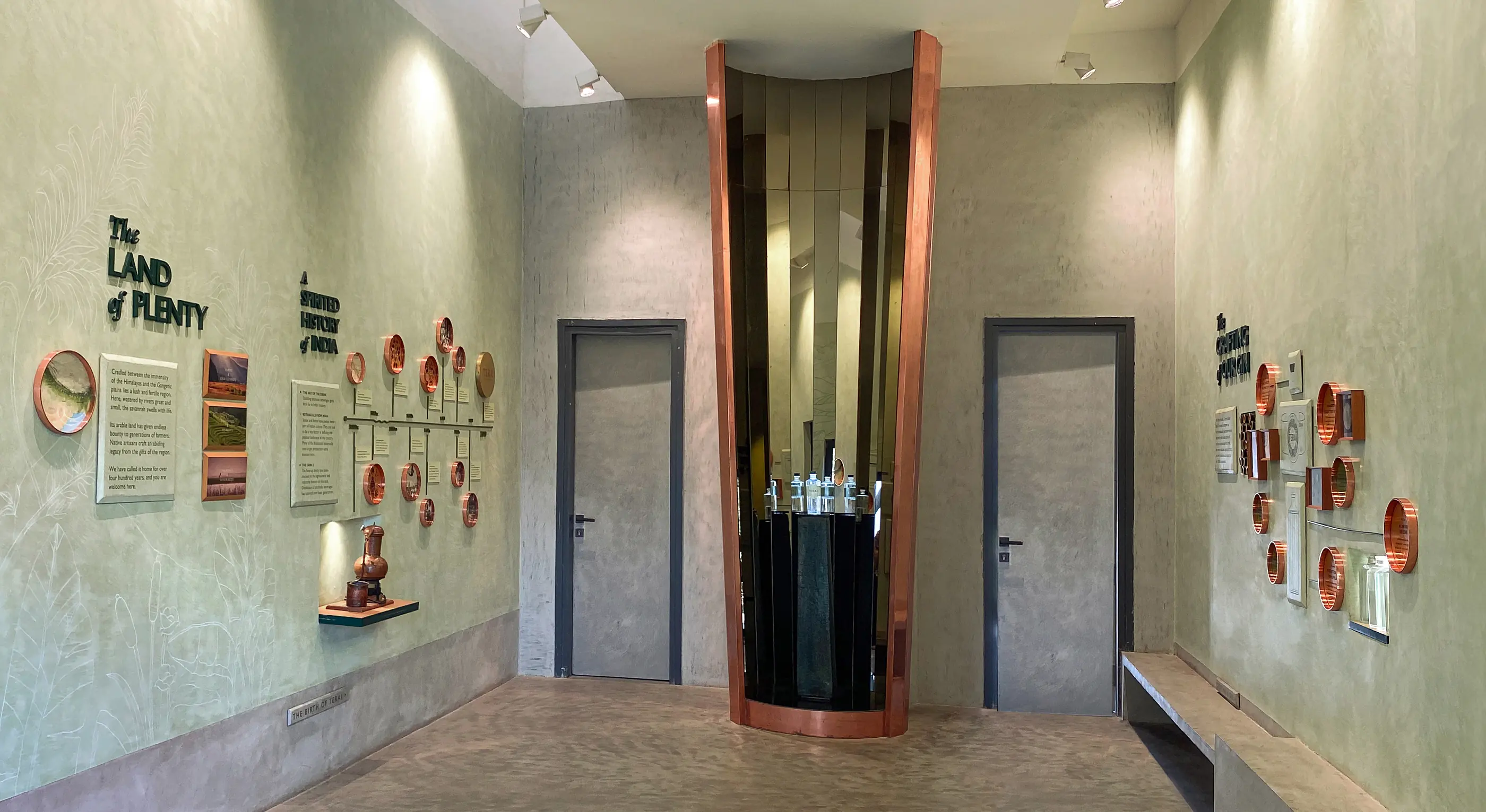 The Story: While designing Terai Gin's story and packaging, a rich narrative emerged—India's legacy as a source of rare spices and botanicals, its centuries-old history of alcohol production, and the Swarup family's lineage as landowners, agriculturalists, and distillers. These threads are woven into a clear spatial narrative, unfolding across a dedicated exhibition area and the main distilling hall.